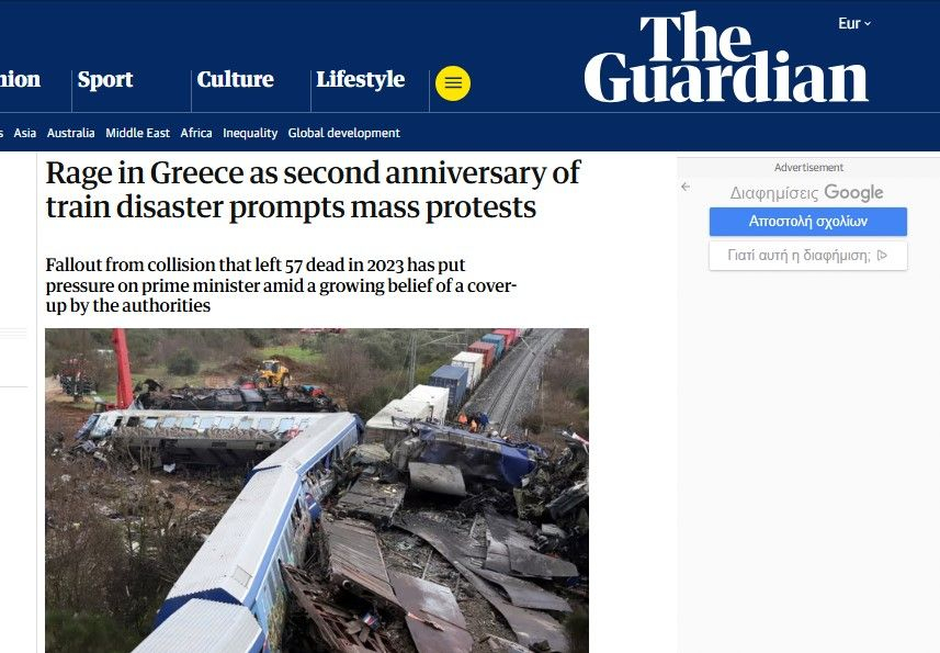 Ο βρετανικός Guardian φιλοξενεί στην πρώτη σελίδα του άρθρο με τίτλο: “Οργή στην Ελλάδα καθώς η δεύτερη επέτειος της σιδηροδρομικής τραγωδίας πυροδοτεί μαζικές διαδηλώσεις”. Το βρετανικό μέσο αναφέρει χαρακτηριστικά: «Από την πρώτη εκλογή του τον Ιούλιο του 2019, ο Μητσοτάκης, δεν έχει αντιμετωπίσει τέτοια κοινωνική αναταραχή. Η δημόσια οργή για τη διαχείριση του δυστυχήματος έχει επιδεινωθεί από την αυξανόμενη αίσθηση συγκάλυψης εκ μέρους της κυβέρνησης».