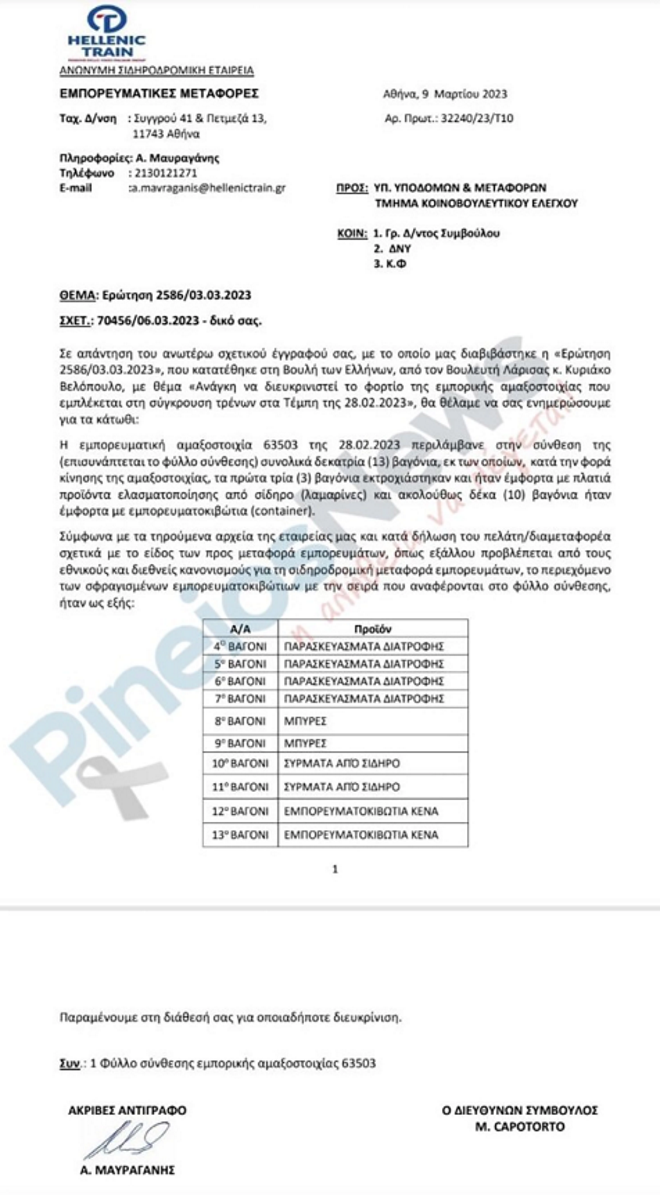 Αναλυτικά το έγγραφο αναφέρει: «Σε απάντηση του ανωτέρω σχετικού έγγραφού σας, με το οποίο μας διαβιβάστηκε η ‘Ερώτηση 2506/03.03.2023′, που κατατέθηκε στη Βουλή των Ελλήνων, από τον Βουλευτή Λάρισας κ. Κυριάκο Βελόπουλο, με θέμα Ανάγκη να διευκρινιστεί το φορτίο της εμπορικής αμαξοστοιχίας που εμπλέκεται στη σύγκρουση τρένων στα Τέμπη της 28.02.2023’, θα θέλαμε να σας ενημερώσουμε για τα κάτωθι: