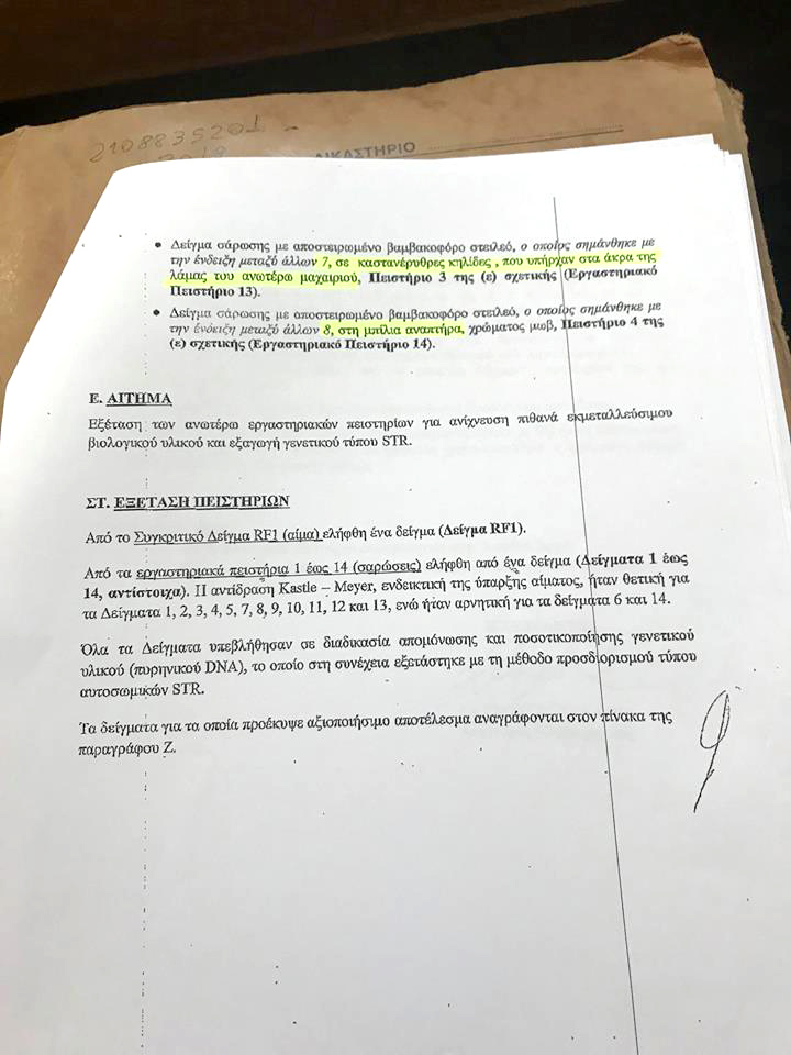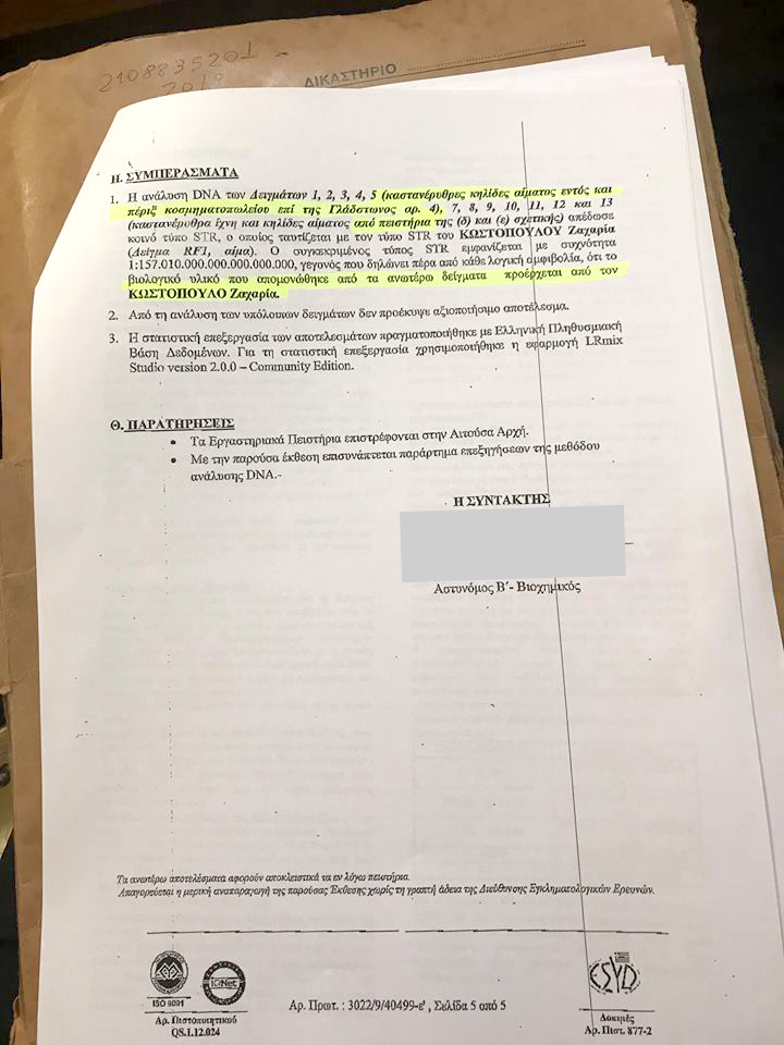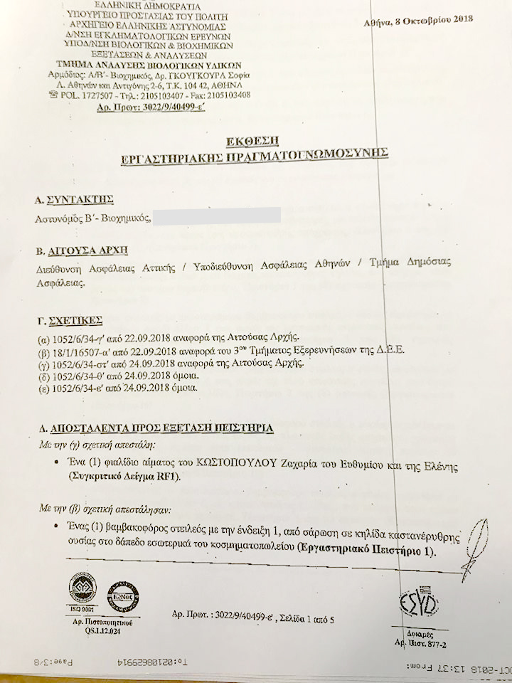 Εχθές, το News 24/7 έφερε στο φως της δημοσιότητας αποκλειστικά το έγγραφο που αποδείκνυε πως δεν εντοπίστηκαν δακτυλικά αποτυπώματα στο μαχαίρι και σήμερα δημοσιεύει την έκθεση της Εργαστηριακής Πραγματογνωμοσύνης σχετικά με την εύρεση του DNA.