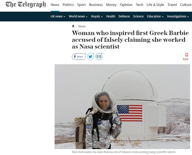 Δημοσίευμα με τίτλο «Η πρώτη Ελληνίδα Barbie κατηγορείται ότι ψευδώς δούλεψε στη NASA», επικαλείται τον εκπρόσωπο της NASA που δήλωσε οτι η Ελένη Αντωνιάδου δεν εργάστηκε ποτέ στην αμερικανική διαστημική υπηρεσία.