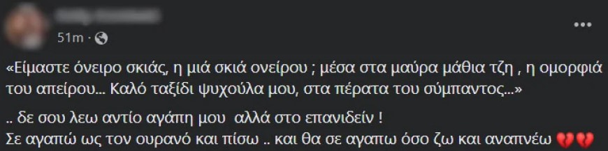 “Είμαστε όνειρο σκιάς, η μιά σκιά ονείρου; Μέσα στα μαύρα μάθια τζη, η ομορφιά του απείρου… Καλό ταξίδι ψυχούλα μου, στα πέρατα του σύμπαντος…