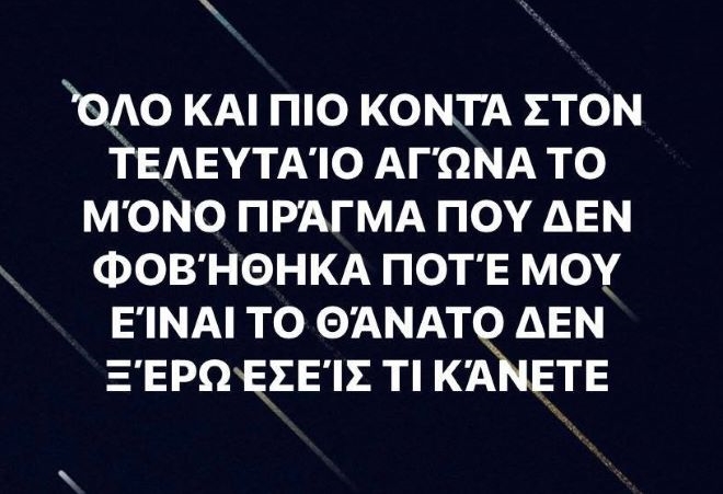 “Όλο και πιο κοντά στον τελευταίο αγώνα. Το μόνο πράγμα που δεν φοβήθηκα ποτέ μου είναι τον θάνατο. Δεν ξέρω εσείς τι κάνετε”, φαίνεται να έγραψε ο άνδρας στο Facebook.