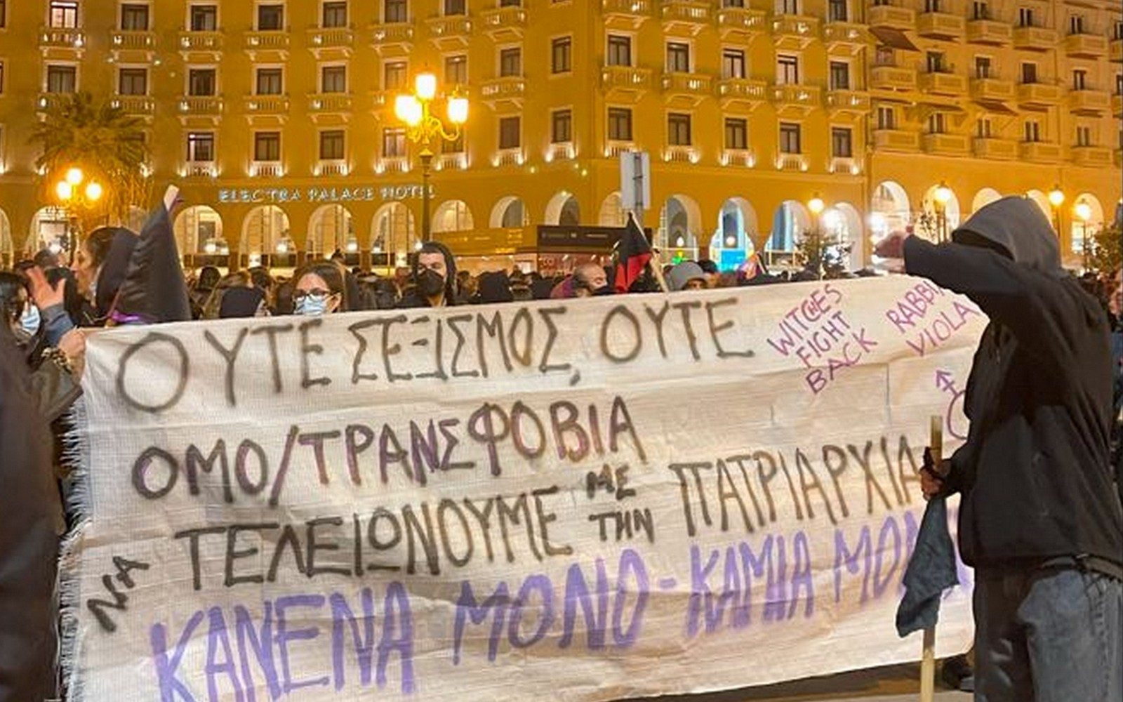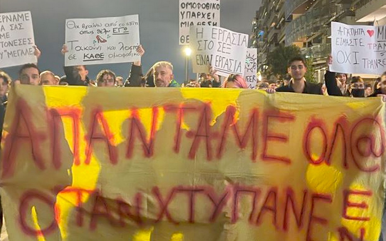 Εκατοντάδες άτομα διαδήλωσαν κατά της ομοφοβίας και της τρανσφοβίας στο κέντρο της Θεσσαλονίκης, μετά τη σοκαριστική επίθεση που δέχτηκαν δύο τρανς άτομα από όχλο στην πλατεία Αριστοτέλους, το βράδυ του Σαββάτου (9/3).