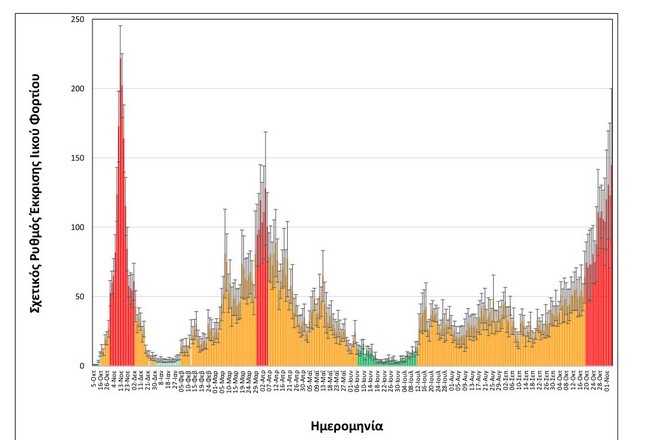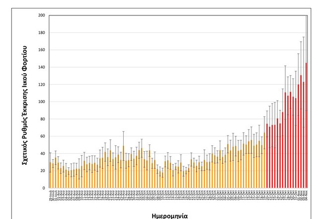 Μεγαλύτερο κι από τις υψηλότερες τιμές του τρίτου κύματος είναι πλέον το ιικό φορτίο της Θεσσαλονίκης. Διαγραμματική απεικόνιση της ραγδαίας αύξησης.