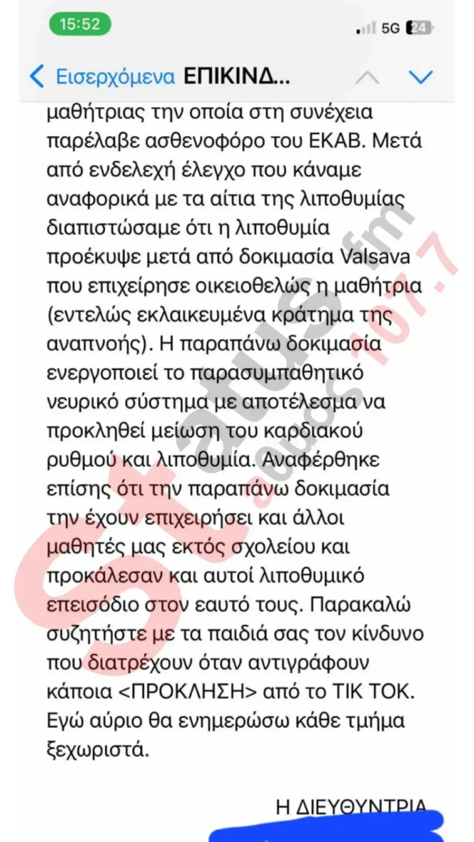Παιδιά του 1ου Γυμνασίου Συκεών Θεσσαλονίκης πήραν μέρος σε challenge του TikTok που έπρεπε να κρατήσουν την αναπνοή τους, με αποτέλεσμα μια μαθήτρια να λιποθυμήσει.