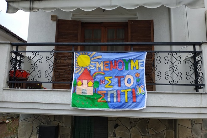 Στο πανό αυτό δεν κατέγραψαν τα αιτήματά τους, ούτε πρόκειται για κάποια διαμαρτυρία. Αποτύπωσαν σε ένα σεντόνι την έκκληση να μείνουμε όλοι στο σπίτι μας, στέλνοντας το μήνυμα στους διερχόμενους. Το πολύχρωμο πανό «τραβά» τα βλέμματα, καθώς η διάστασή του είναι 1.10Χ1.00 μέτρο. Οι δυο μικροί δημιουργοί έδιναν επί τρεις μέρες «μάχη» με τα πινέλα, προκειμένου να ολοκληρώσουν το έργο τους.