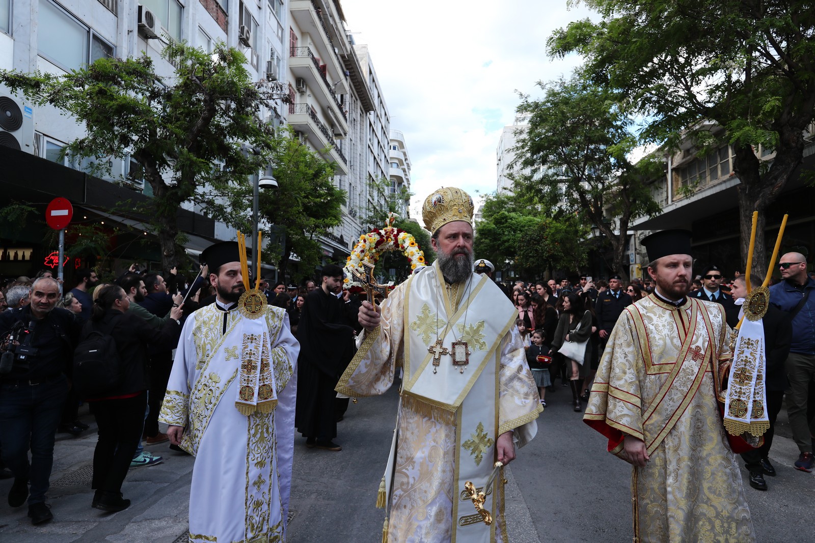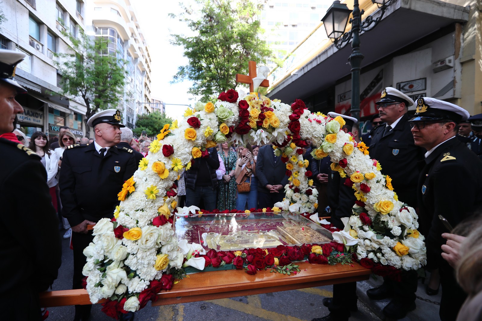 Σε κλίμα κατάνυξης και με πλήθος πιστών πραγματοποιείται αυτήν την ώρα η περιφορά του Επιταφίου του Ιερού Ναού Αγίου Μηνά, στο κέντρο της Θεσσαλονίκης.