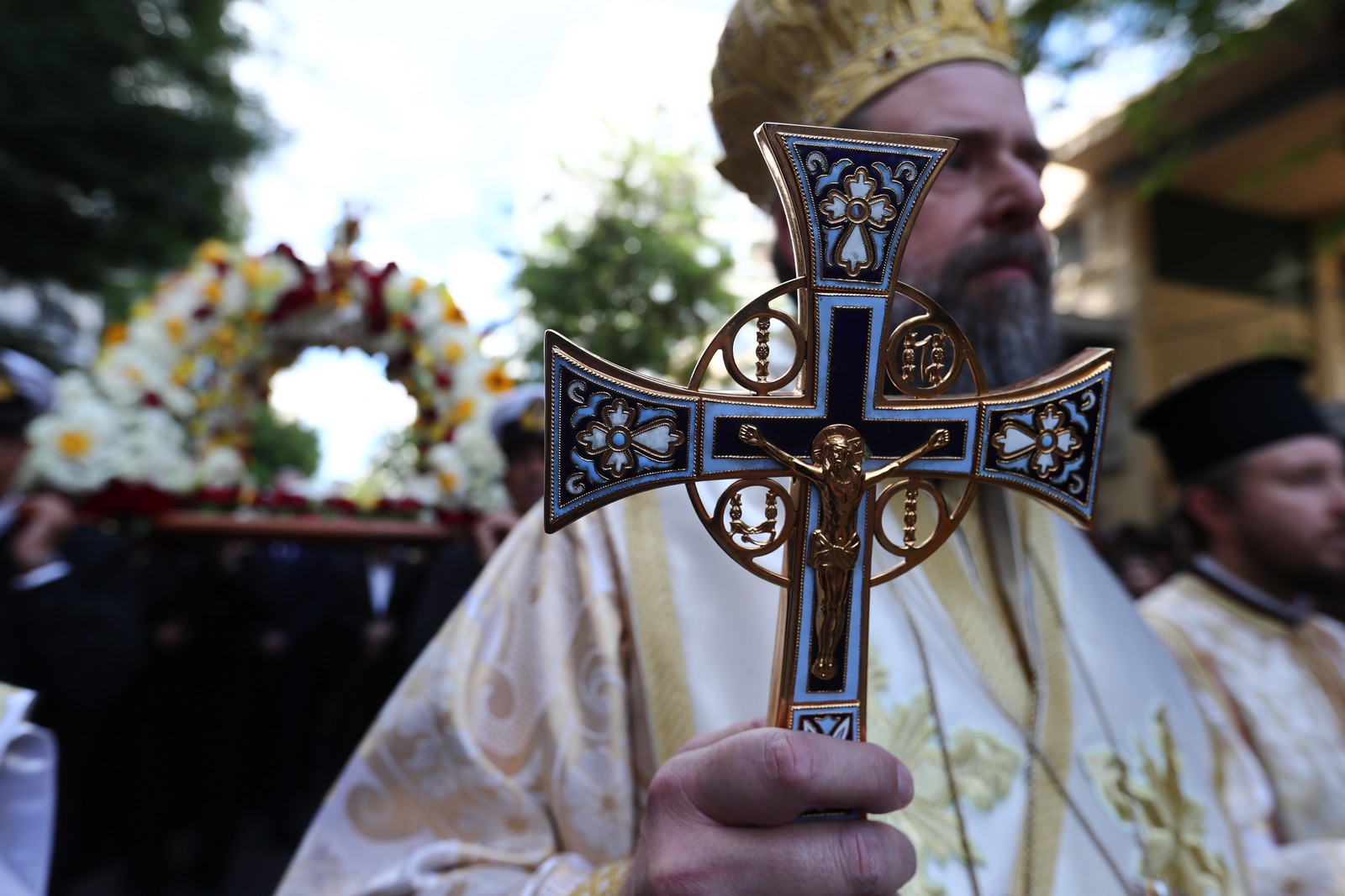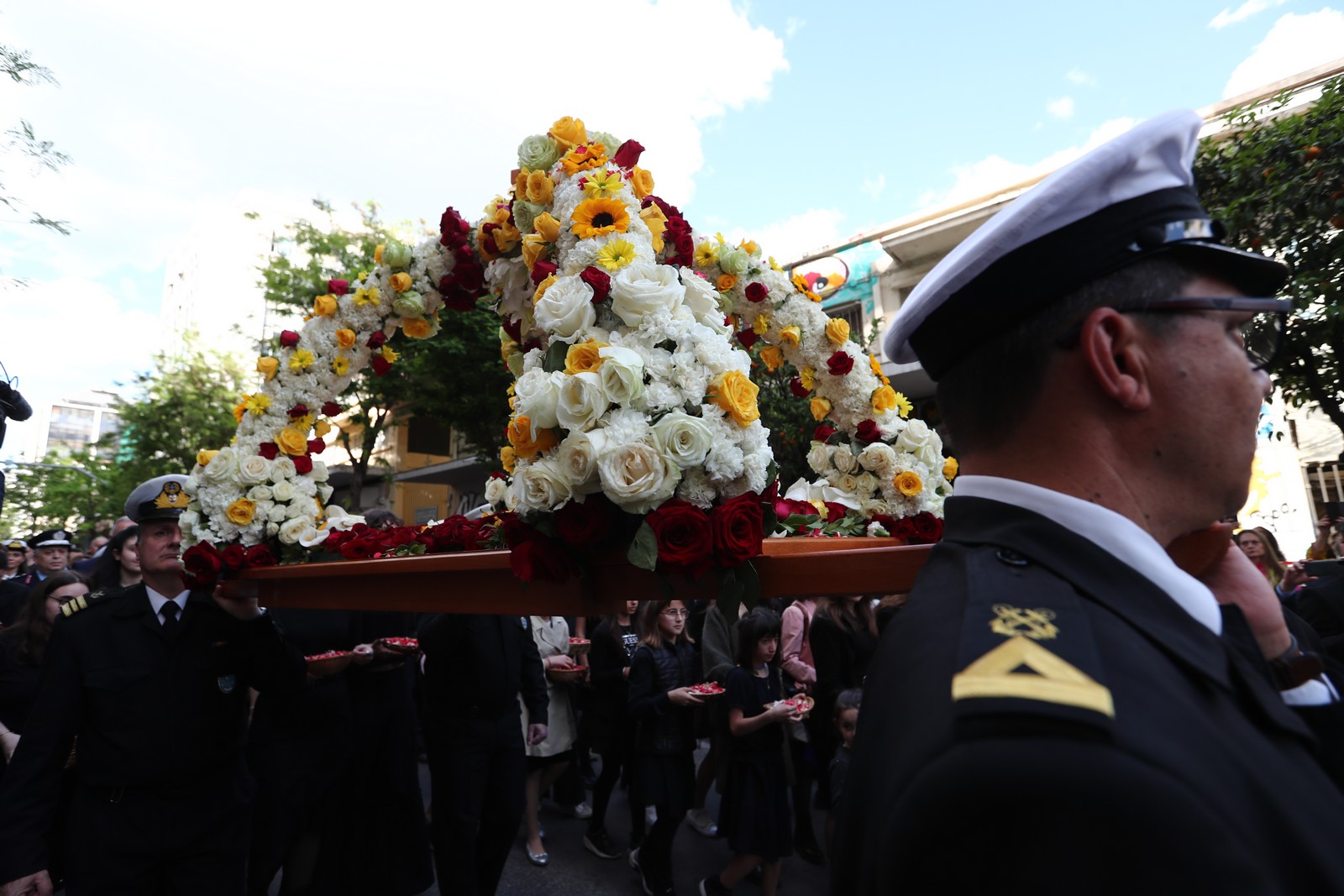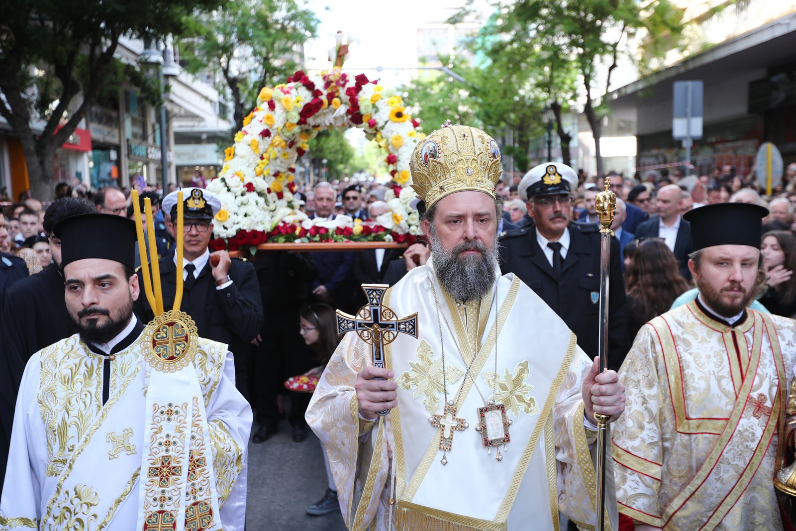 Μέσα σε κλίμα θρησκευτικής ευλάβειας, χοροστατούντος του μητροπολίτη Φιλόθεου και υπό τους ήχους θρησκευτικών ψαλμωδιών από τη μπάντα της αστυνομίας και των φιλαρμονικών, η πομπή ξεκίνησε την πορεία της στους κεντρικούς δρόμους της πόλης.