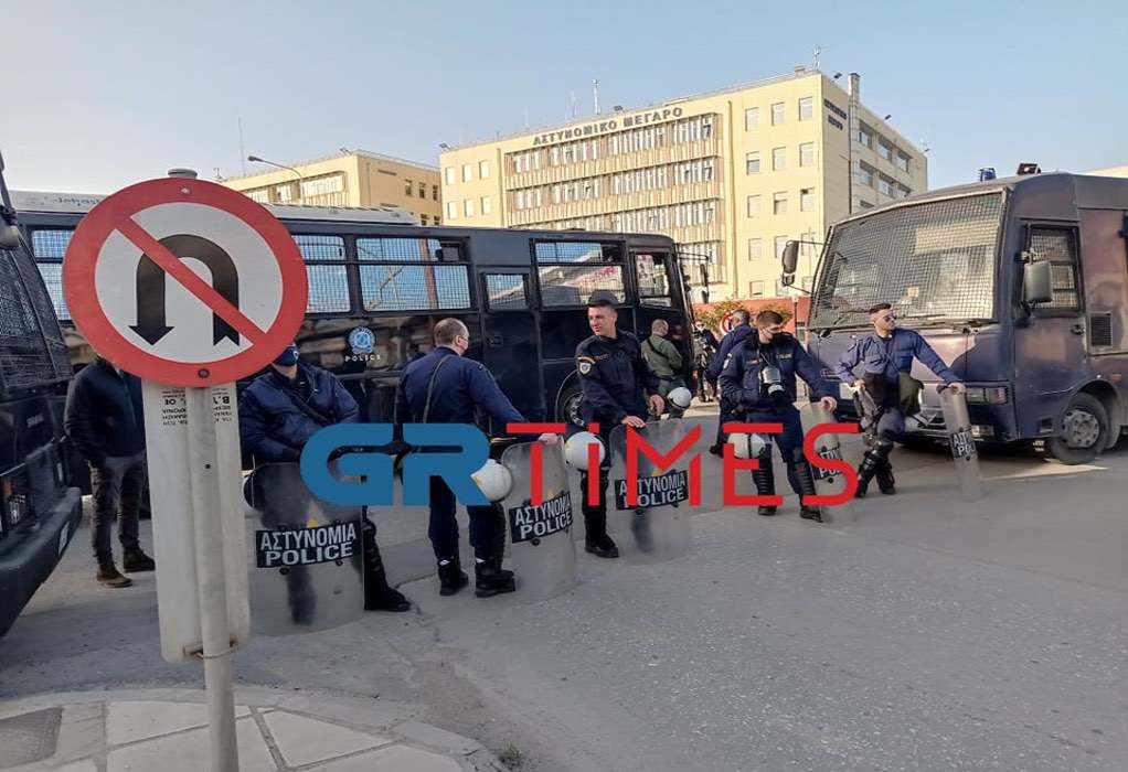 Το αστυνομικό Μέγαρο έχει μετατραπεί σε φρούριο, σύμφωνα με το GRTIMES, με ισχυρές αστυνομικές δυνάμεις να δημιουργούν φραγμό επί της Μοναστηριού, κλείνοντας παράλληλα και την κυκλοφορία στα διερχόμενα οχήματα, και αποτρέποντας παράλληλα τους συγκεντρωμένους να προχωρήσουν περαιτέρω.