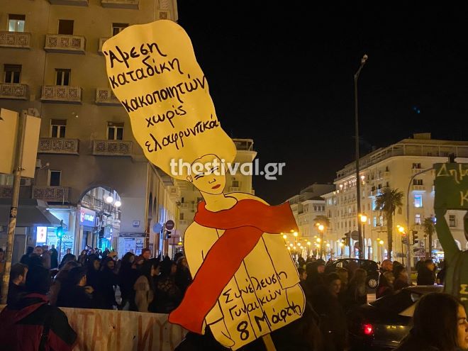 Οι γυναίκες στην Θεσσαλονίκη βγήκαν στους δρόμους για να διαμαρτυρηθούν για την έμφυλη βία, κρατώντας πλακάτ που έγραφαν "άμεση καταδίκη κακοποιητών χωρίς ελαφρυντικά".