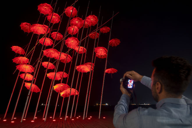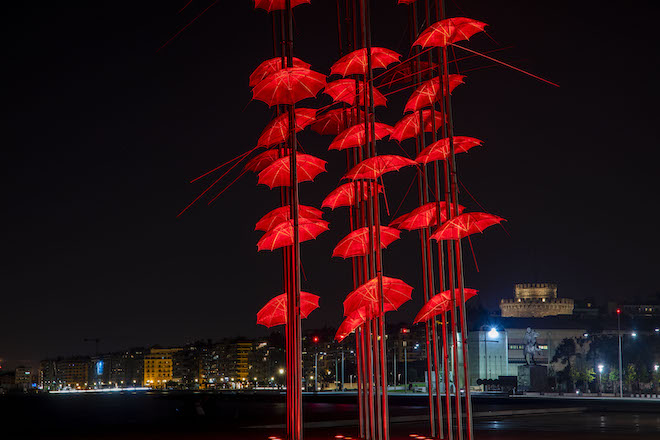 Με κόκκινο χρώμα φωτίστηκαν εχθές οι "Ομπρέλες" του Ζογγολόπουλου στην παραλία Θεσσαλονίκης. Σήμερα, Μεγάλη Παρασκευή, πρόκειται να φωτιστούν με πένθιμο μωβ χρώμα.