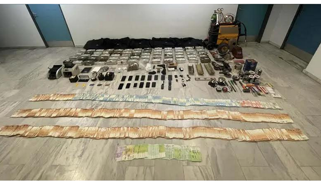Σε έρευνες που πραγματοποιήθηκαν σε οικίες, αποθήκες και αυτοκίνητα, βρέθηκαν και κατασχέθηκαν, ποσότητα κοκαΐνης, συνολικού βάρους 104 κιλών και 665 γραμμαρίων, 811 γραμμάρια κάνναβης, ναρκωτικά δισκία, 284.250 ευρώ, ως προερχόμενα από εμπορία ναρκωτικών ουσιών, ένα πιστόλι, ένα πιστόλι κρότου – αερίου, φυσίγγια, συσκευή εκκένωσης ρεύματος, ζυγαριές ακριβείας, 18 κινητά τηλέφωνα, 5 ρολόγια χειρός μεγάλης αξίας και εξοπλισμός για τη διενέργεια σιδηρουργικών εργασιών.