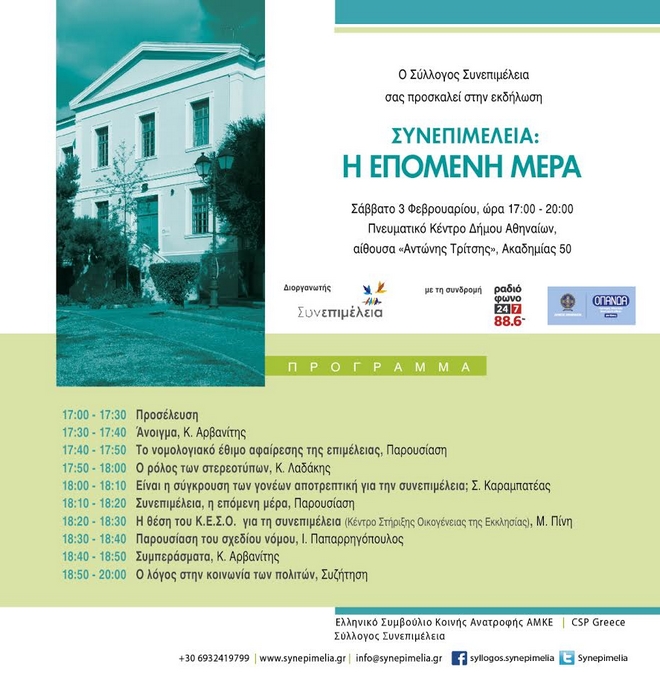 Ο Συλλογος ΣΥΝΕΠΙΜΕΛΕΙΑ – C.S.P. Greece με την συμμετοχή του Ραδιοφώνου 24/7 στους 88.6 και του ΟΠΑΝΔΑ διοργανώνει εκδήλωση στο Πνευματικό Κέντρο Δήμου Αθηναίων (αίθουσα Α. Τρίτση) το Σάββατο 3 Φεβρουαρίου 2018 στις 17:00 με θέμα «ΣΥΝΕΠΙΜΕΛΕΙΑ: Η ΕΠΟΜΕΝΗ ΜΕΡΑ».