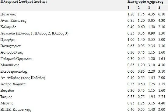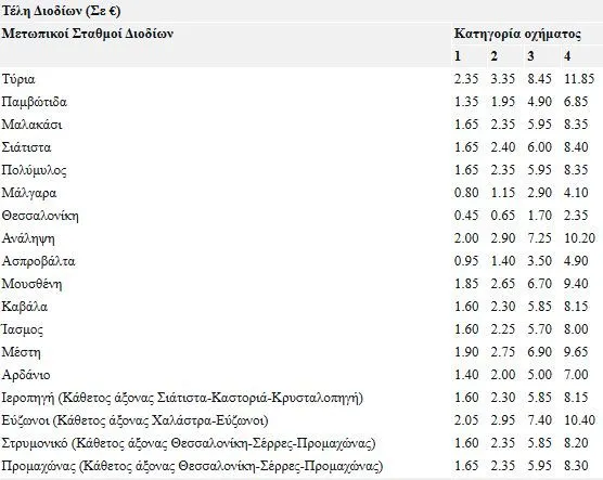 Οι νέες τιμές που θα ισχύσουν από την 1η Ιανουαρίου του 2026 στην Εγνατία Οδό.