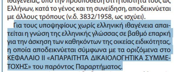 Τι λέει λοιπόν το περιβόητο 3485/22-8-2020 ΦΕΚ της Ελληνικής Κυβέρνησης; Αντιγράφουμε: “Για τους υποψηφίους χωρίς ελληνική ιθαγένεια απαιτείται η γνώση της ελληνικής γλώσσας σε βαθμό επαρκή για την άσκηση των καθηκόντων της οικείας ειδικότητας,η οποία αποδεικνύεται σύμφωνα με τα οριζόμενα στο ΚΕΦΑΛΑΙΟ ΙΙ «ΑΠΑΡΑΙΤΗΤΑ ΔΙΚΑΙΟΛΟΓΗΤΙΚΑ ΣΥΜΜΕΤΟΧΗΣ» του παρόντος Παραρτήματος”.