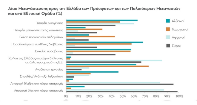 - Το 91% των νεότερων μεταναστών και προσφύγων (και σχεδόν όλοι οι Σύροι) δηλώνουν ως αιτία μετανάστευσης την “αποφυγή βίας”, κάτι που δηλώνουν λιγότερο από το 20% των Αλβανών και λιγότερο από το 5% των Γεωργιανών.