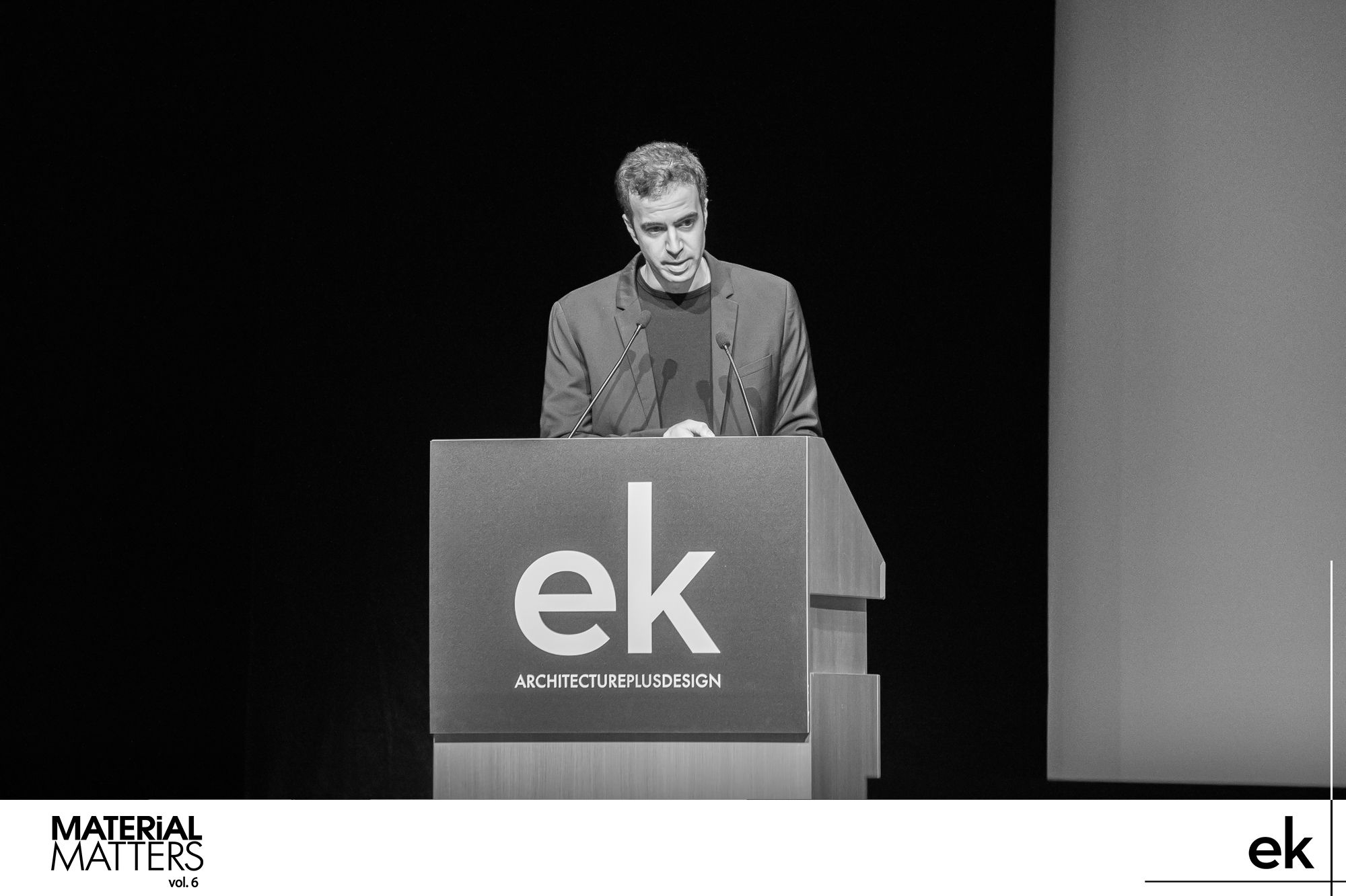 Πρώτος ομιλητής της βραδιάς του Material Matters ήταν ο Πάνος Ηλιόπουλος, μέλος του ΔΣ της Ελληνικής Ένωσης Μαρμάρου, ο οποίος ανέδειξε την ιδιότητα του πετρώματος να εγγράφει στο σώμα του τη διάσταση του γεωλογικού χρόνου και να αποδίδει ξεχωριστές αισθητικές ποιότητες.
