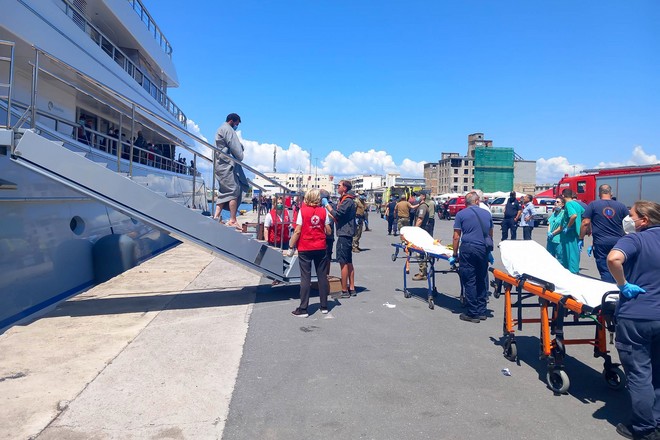Οι 100 από τους διασωθέντες μετανάστες  έφτασαν περίπου στις 12 το μεσημέρι στο λιμάνι της Καλαμάτας με το σκάφος «Mayan Queen IV», σημαίας Νήσων Κέιμαν.