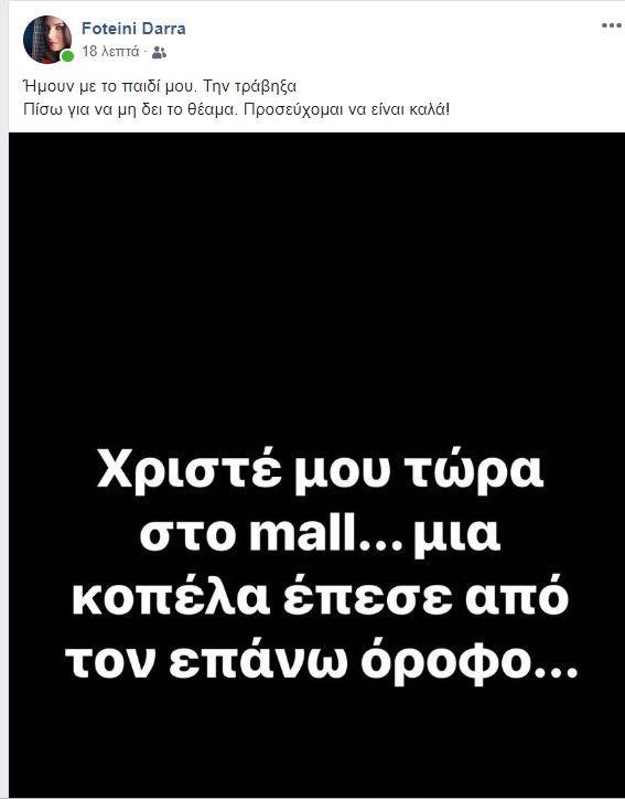 Η Φωτεινή Δάρρα ήταν στο εμπορικό κέντρο με την κόρη της όταν συνέβη το περιστατικό και για να μην σοκαριστεί το παιδί το τράβηξε πίσω, ώστε να μην δει το θέαμα. Η ίδια κοινοποίησε την είδηση με ανάρτησή της στο Instagram.