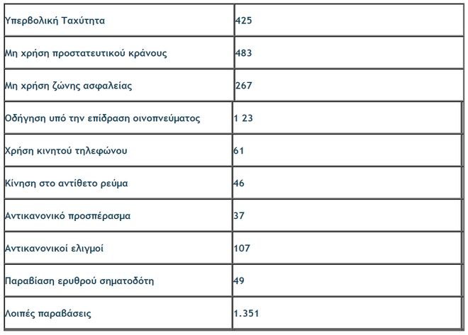 Ενδεικτικό είναι ότι μόλις μέσα σε 5 ημέρες ελέγχων στην Κρήτη, βεβαιώθηκαν περίπου 3.000 παραβάτες με τις περισσότερες παραβάσεις να αφορούν υπερβολική ταχύτητα, αντικανονικούς ελιγμούς, οδήγηση υπό την επήρεια αλκοόλ, μη χρήση ζώνης και κράνους.