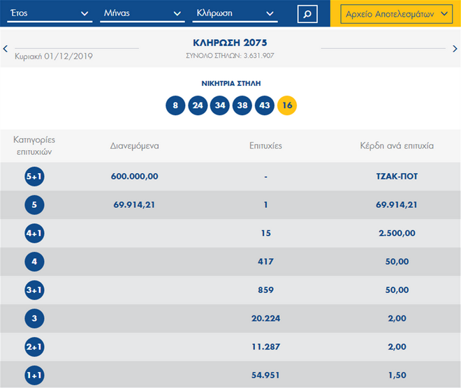 Οι τυχεροί αριθμοί της σημερινής κλήρωσης είναι: 8, 24, 34, 38, 43 και Τζόκερ ο αριθμός 16.