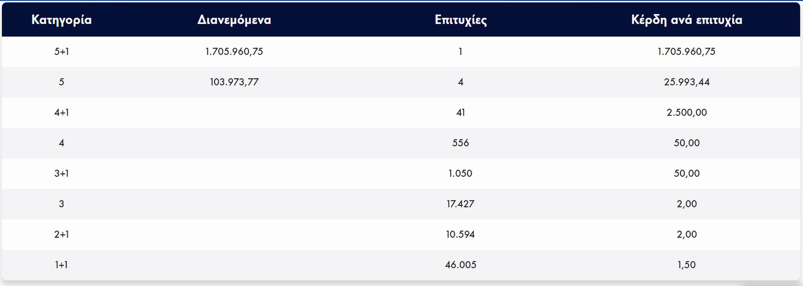 Εκτός από την τεράστια επιτυχία στην πρώτη κατηγορία με τον υπερτυχερό που κέρδισε 1.705.960,75 ευρώ, στη δεύτερη βρέθηκαν 4 τυχεροί που μοιράστηκαν από 25.993,44 ευρώ (συνολικά 103.973,77 ευρώ). Επίσης, προέκυψαν και 41 νικητές για τα 2.500 ευρώ της τρίτης κατηγορίας.