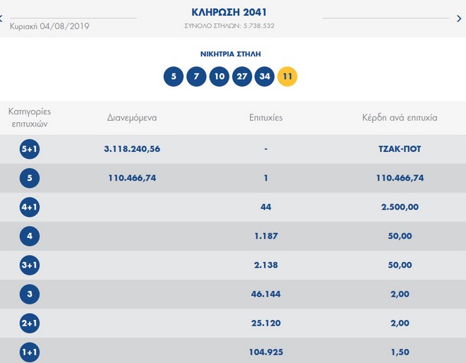Οι τυχεροί αριθμοί που κληρώθηκαν είναι οι εξής: 5, 7, 10, 27, 34 και τζόκερ το 11.