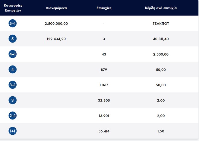 Το ποσό των 2,5 εκατ. ευρώ στην 1η κατηγορία μοίραζε το τζόκερ στην κλήρωση της Κυριακής (04/06), χωρίς και πάλι να βρεθεί νικητής.