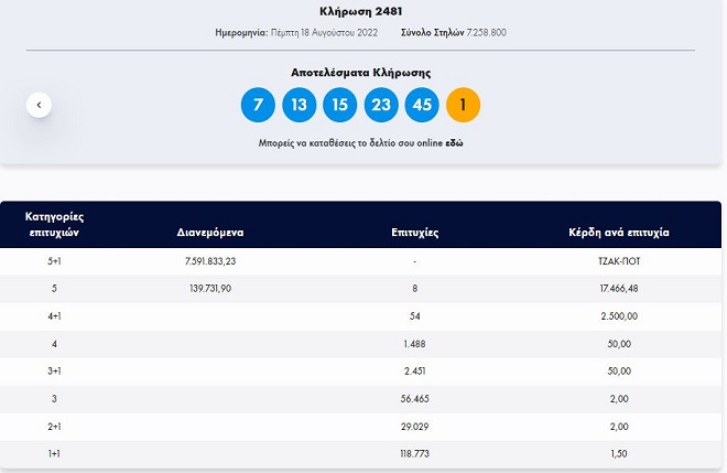 Οι αριθμοί που κληρώθηκαν είναι οι εξής: 7, 13, 15, 23, 45 και τζόκερ το 1.