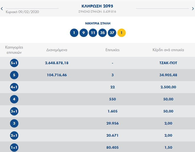 Οι αριθμοί που κληρώθηκαν είναι οι 1, 9, 11, 35, 37 και τζόκερ το 1.