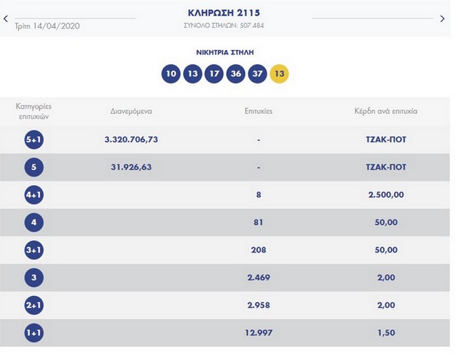 Οι τυχεροί αριθμοί της κλήρωσης είναι οι: 10,13,17,36,37 και τζόκερ το 13.