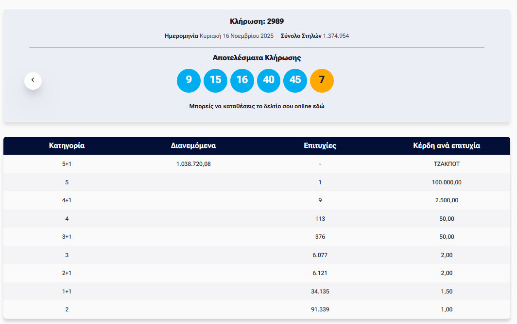Οι τυχεροί αριθμοί της κλήρωσης με αριθμό 2989 είναι οι εξής: