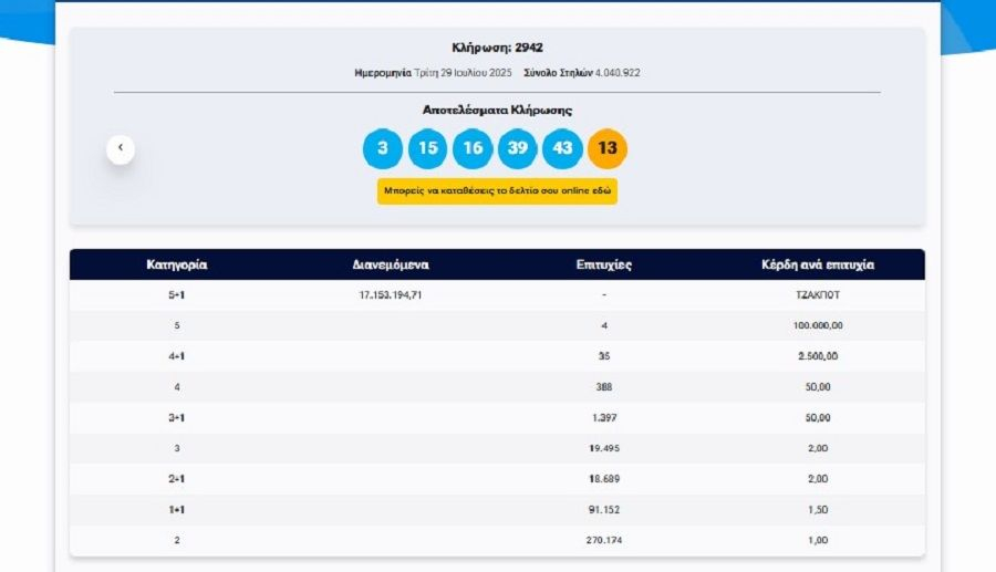 Οι τυχεροί αριθμοί της κλήρωσης με αριθμό 2942 είναι οι εξής: