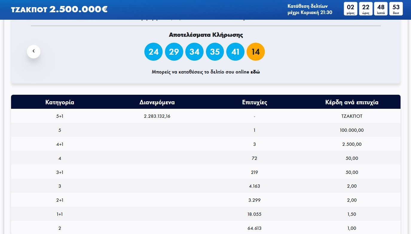 Οι τυχεροί αριθμοί της κλήρωσης με αριθμό 2913 είναι οι εξής:
