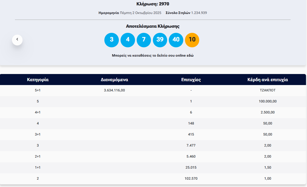 Οι τυχεροί αριθμοί της κλήρωσης με αριθμό 2970 είναι οι εξής: