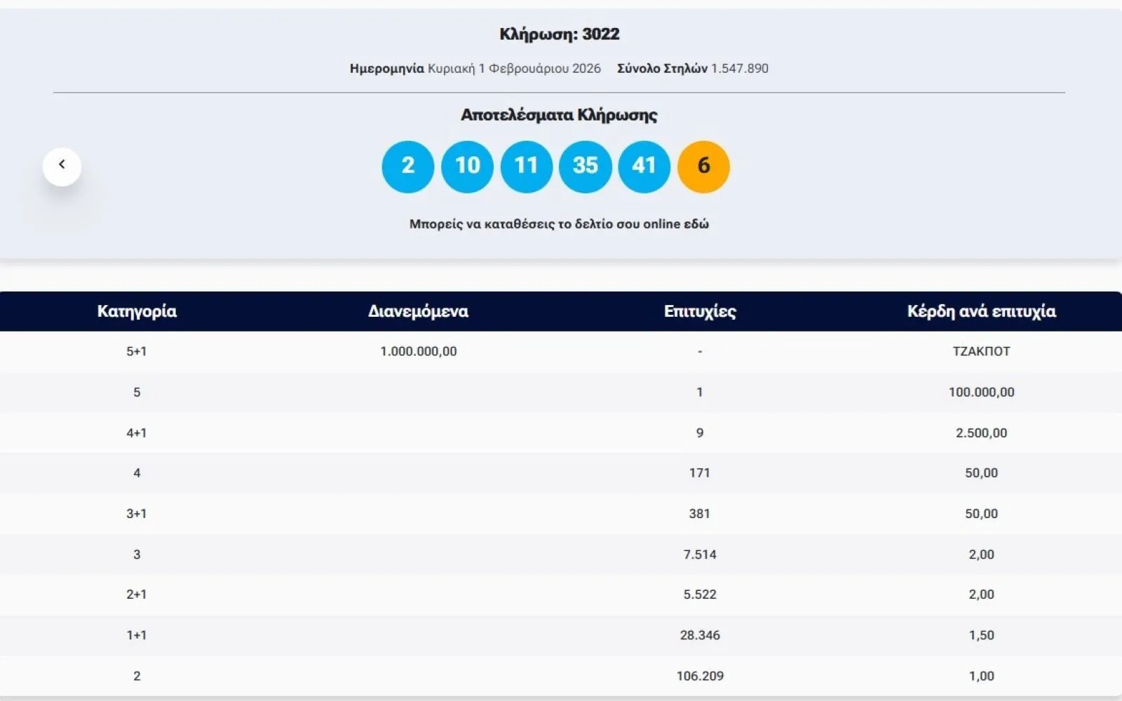 Οι τυχεροί αριθμοί της κλήρωσης με αριθμό 3022 είναι οι εξής:
