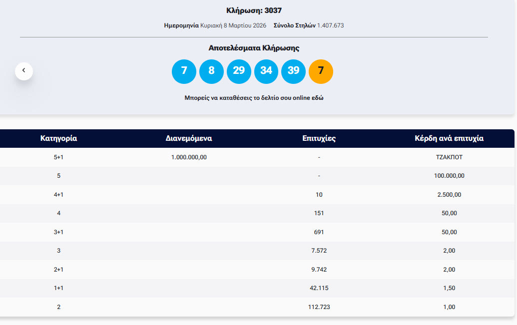 Οι τυχεροί αριθμοί της κλήρωσης με αριθμό 3037 είναι οι εξής: