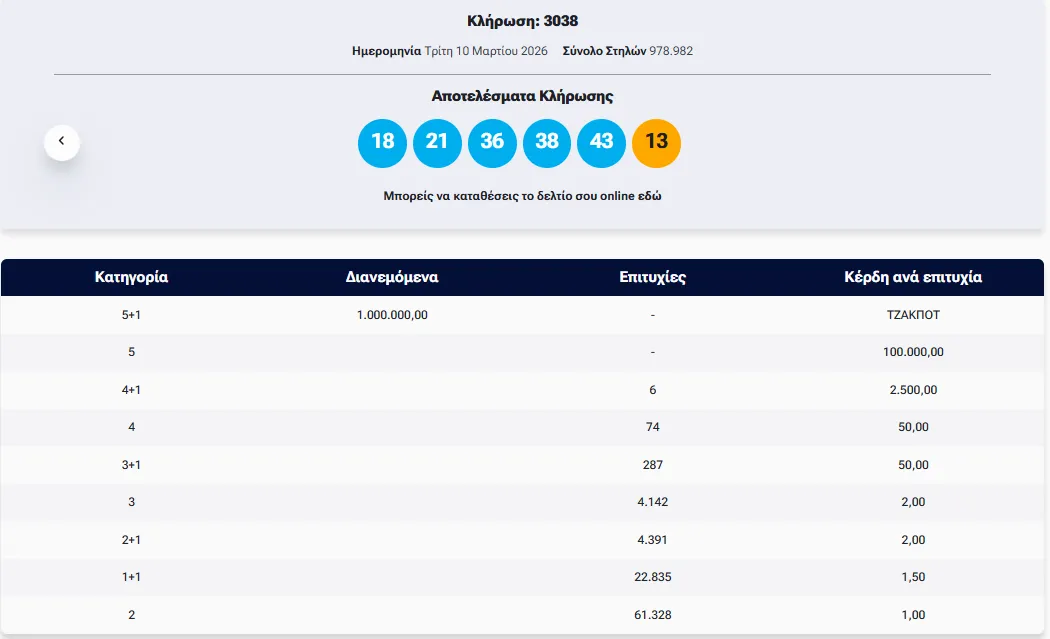 Οι τυχεροί αριθμοί της κλήρωσης με αριθμό 3038 είναι οι εξής: