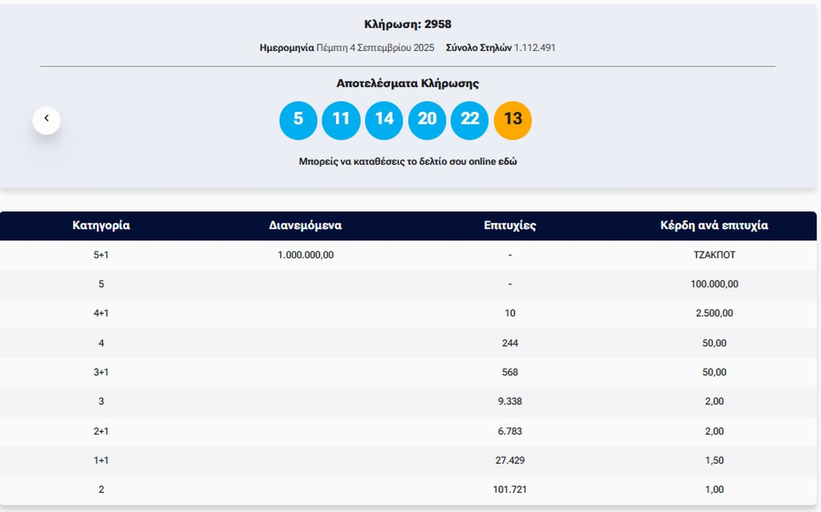 Οι τυχεροί αριθμοί της κλήρωσης με αριθμό 2958 είναι οι εξής: