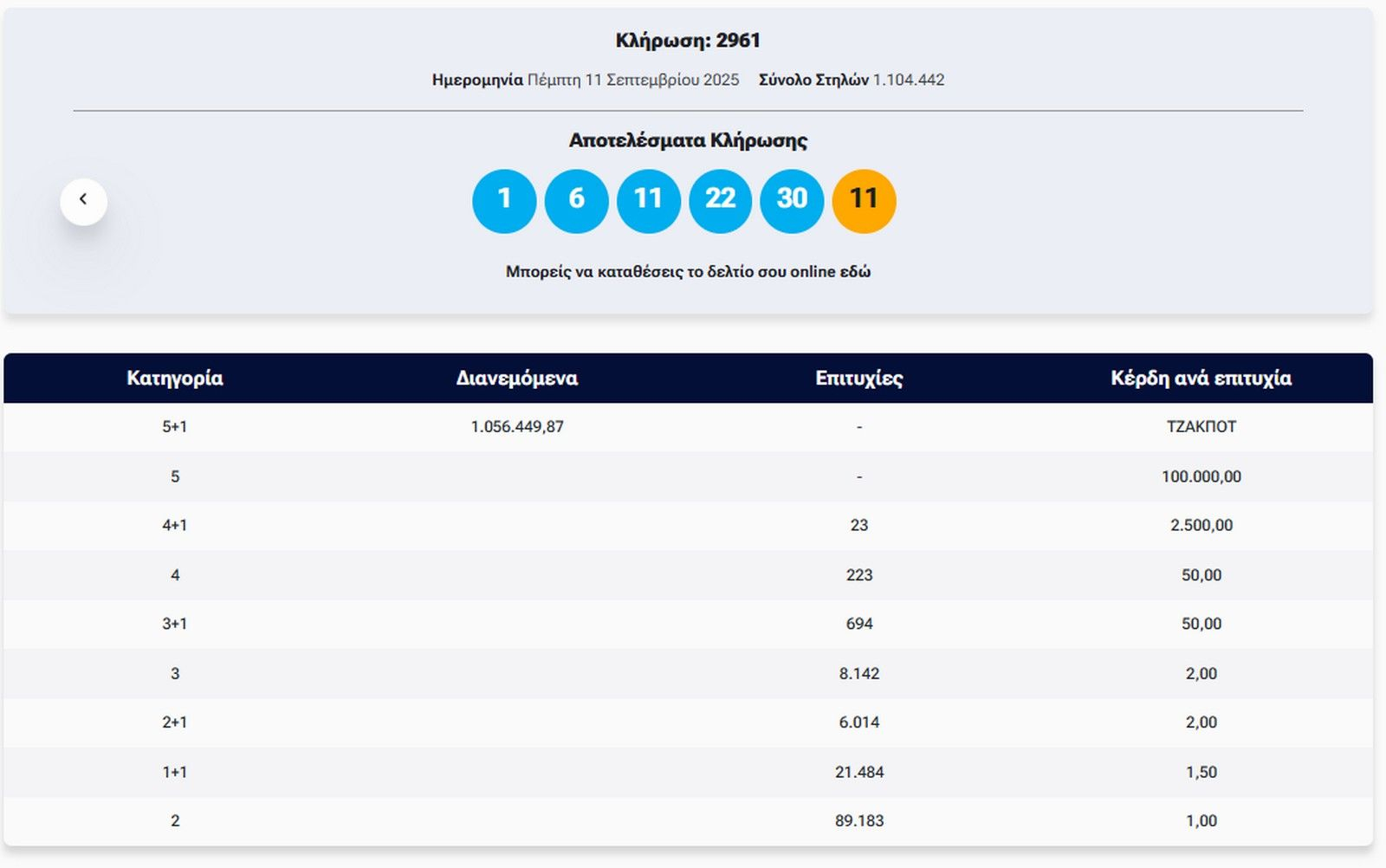 Οι τυχεροί αριθμοί της κλήρωσης με αριθμό 2961 είναι οι εξής: