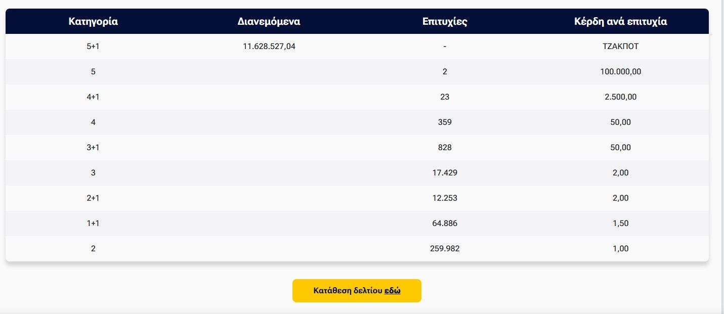 Στην αποψινή κλήρωση είχαμε ξανά τζακ ποτ. Επίσης, δύο δελτία κερδίζουν από 100.000 ευρώ.
