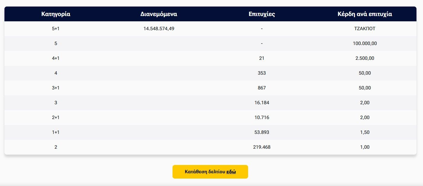 Στην αποψινή κλήρωση είχαμε ξανά τζακ ποτ. Επίσης, νικητής δεν υπήρξε ούτε στη δεύτερη κατηγορία, ενώ 21 δελτία κέρδισαν από 2.500 ευρώ.