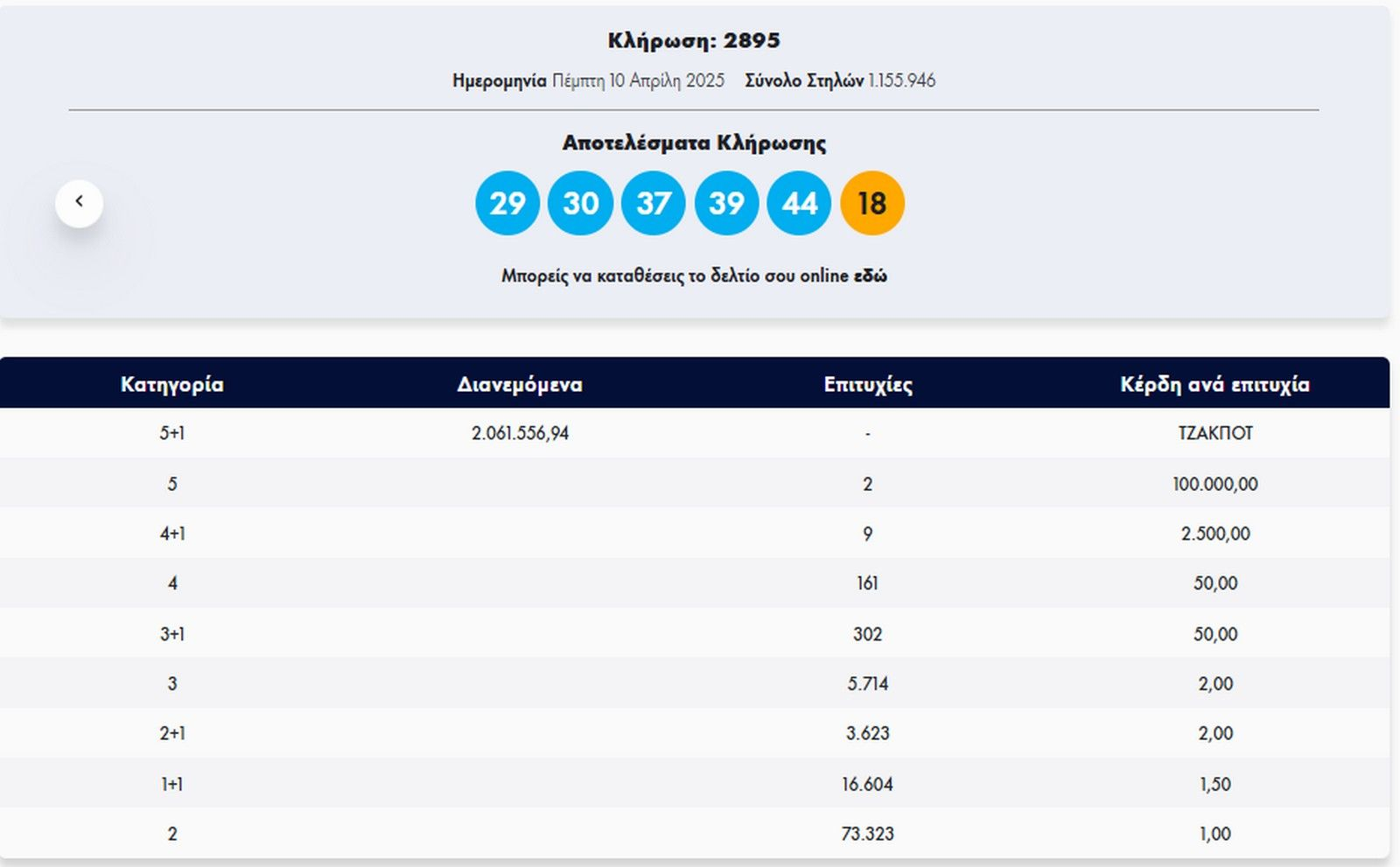 Οι τυχεροί αριθμοί της κλήρωσης με αριθμό 2895 είναι οι εξής: