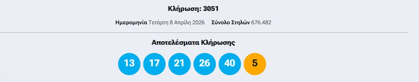 Οι τυχεροί αριθμοί της κλήρωσης με αριθμό 3051 είναι οι εξής: