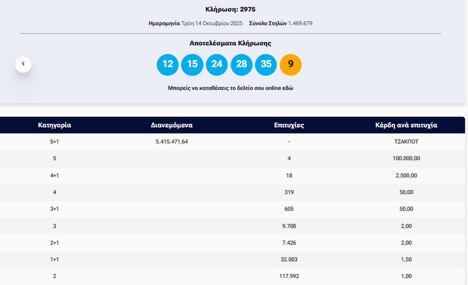 Οι τυχεροί αριθμοί της κλήρωσης με αριθμό 2975 είναι οι εξής: