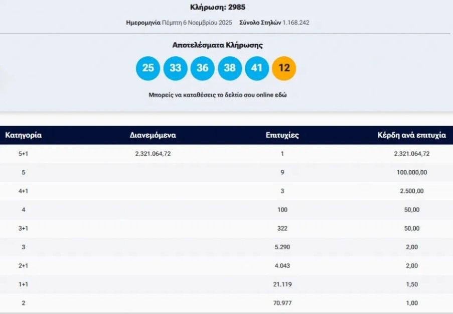 Πραγματοποιήθηκε το βράδυ της Πέμπτης (06/11), η κλήρωση του Τζόκερ, το οποίο μοίραζε τουλάχιστον 2 εκατομμύρια ευρώ στην πρώτη κατηγορία.