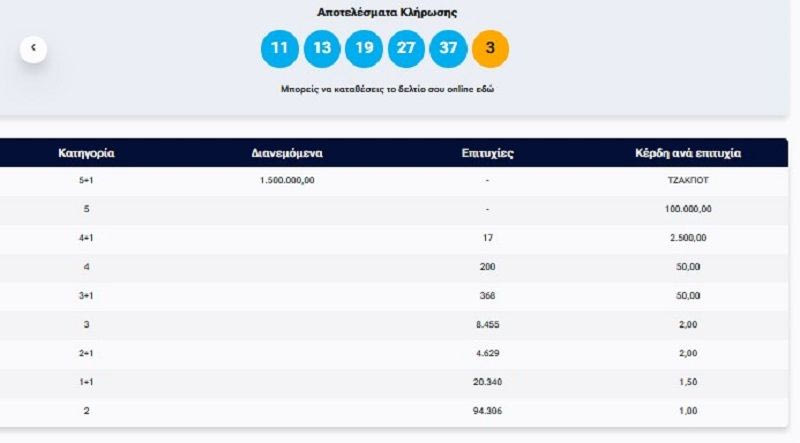 Οι τυχεροί αριθμοί της κλήρωσης με αριθμό 2991 είναι οι εξής: