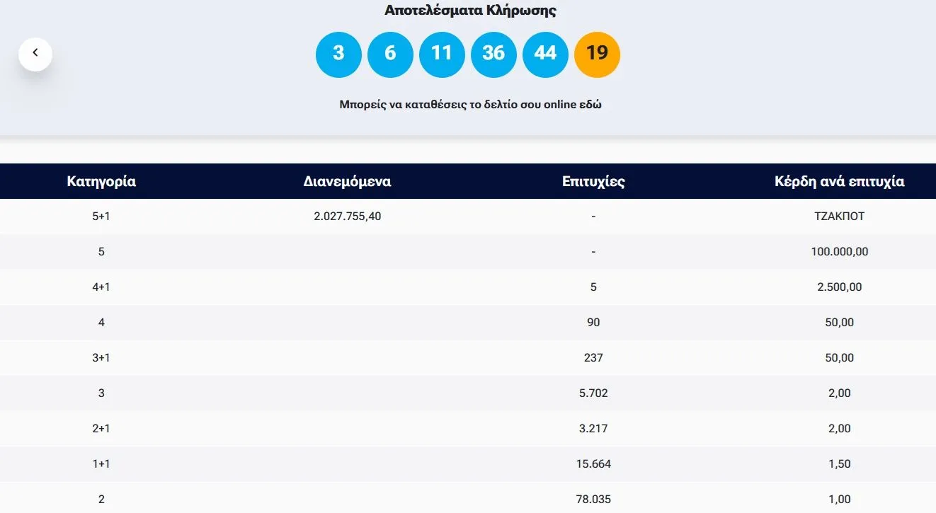 Σημειώνεται πως είχαμε τζακ ποτ στην αποψινή κλήρωση, καθώς δεν βρέθηκε υπερτυχερός στην πρώτη κατηγορία, όπως ούτε και στη δεύτερη.