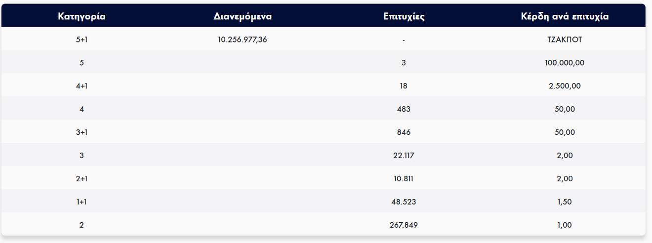 Στη δεύτερη κατηγορία αναδείχθηκαν 3 τυχεροί που κερδίζουν από 100.000 ευρώ, ενώ στην πρώτη κατηγορία σημειώθηκε νέο τζακ ποτ.