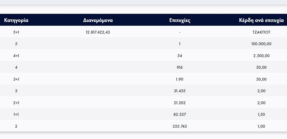 Στην επόμενη κλήρωση της Πέμπτης (16/01) οι τυχεροί της πρώτης κατηγορίας θα μοιραστούν το ποσό των 13.800.000 ευρώ.